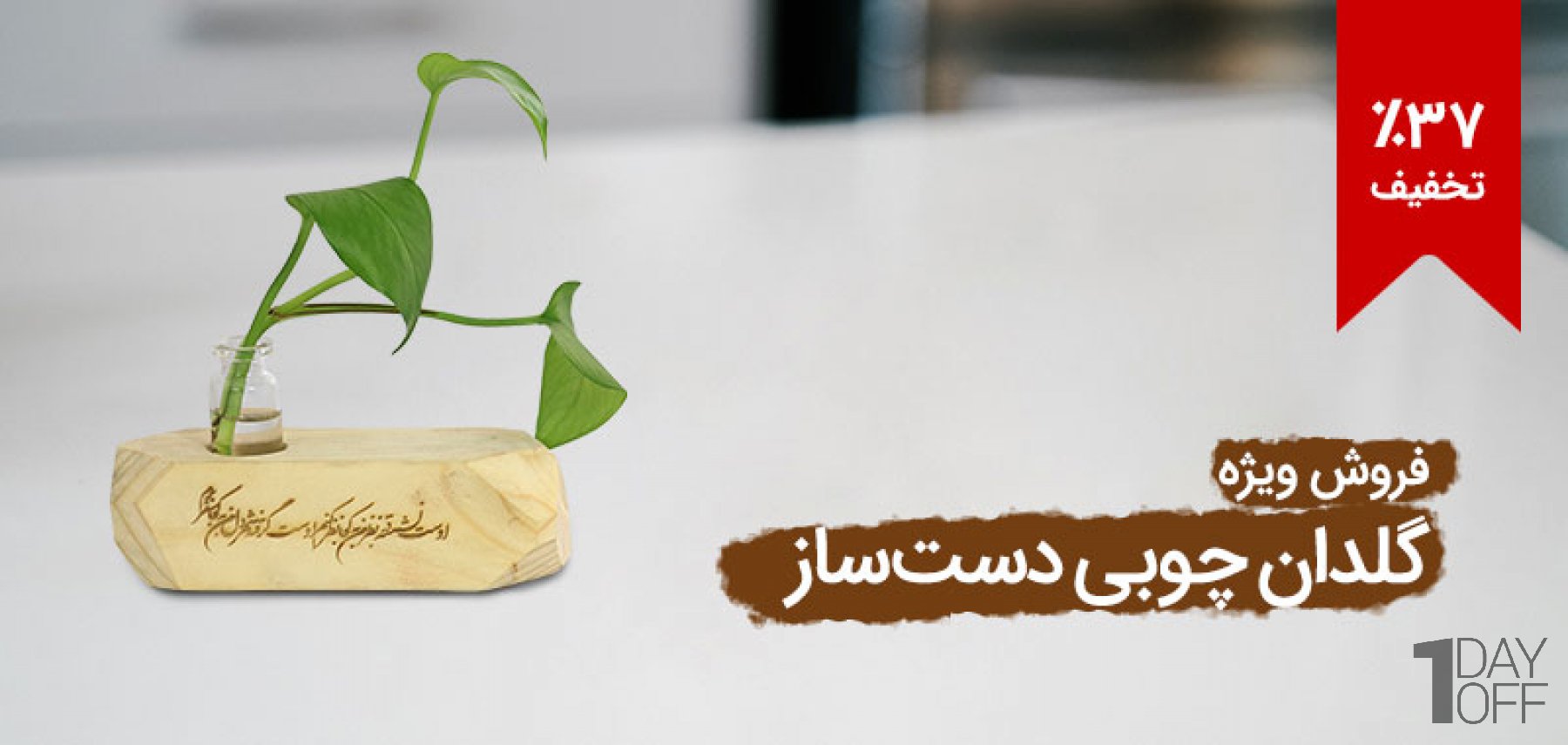 نمایش محصولات مرتبط با پروموشن گلدان چوبی دست‌ساز به‌همراه متن لیزر شده و یک شاخه گیاه پتوس